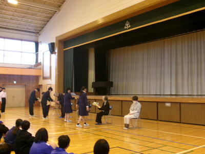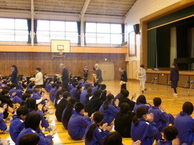 2026.3.3(火) 感謝の集い 投稿: 学校管理者 (16:06) カテゴリー: 今日の出来事 本日は感謝の集いが行われました。 本校ではSSVCの方々に家庭学習ノートのチェックや数学の授業のサポートに、図書ボランティアの方々には読み聞かせを行っていただいています。 日頃の感謝の気持ちを込めて生徒会より感謝の言葉と花束をお送りしました。 いつも本当にありがとうございます!! そして、これからもよろしくお願いいたします。 Tweet -