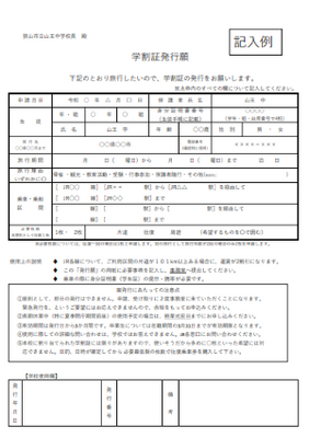 学割証とは、 申請内容が定められた条件に適うものであると学校が判断した場合に発行する、JR 各社の営業キロで 100kmを超える区間を乗車する際に、中学生本人の運賃が 2 割引になるものです。